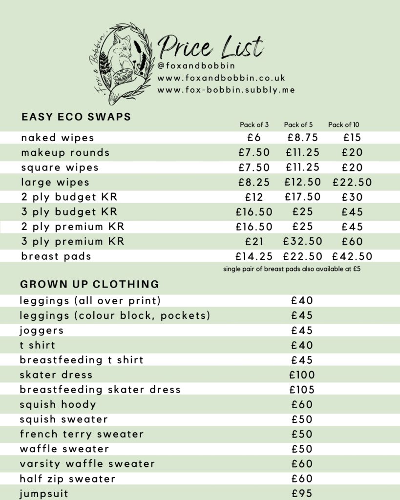 The 1 metre challenge is a really good way to make sure you get the most for your money when ordering clothing from Fox & Bobbin. When you order, you pick your choice of any of my available prints. For £75, you get 1m of your chosen print, plus any matching co-ordinates and notions needed, and the challenge is for me to get as many items out of that metre (in the sizes you specify) as is humanly possible. Any scraps that aren’t big enough to be made into clothing are then turned into other items such as reusable wipes and breast pads, and once I’m left with only tiny amounts of scrap, they’re used as stuffing in my reusable sponges, making them zero waste! I guarantee that you will receive £75 or more* worth of items in your 1m challenge, otherwise I will happily refund the difference or add in extra items to make it up. 1m challenge orders regularly go into the £100+ price range!