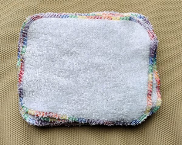 Named for their lack of cotton backing, naked wipes are made from a single layer of double sided bamboo terry towelling, and measure approximately 15x18cm, which makes them a little larger than the cotton backed rounds and squares; big enough for the old wipe, fold, wipe routine. Choose from a classic white stitch finish, or go for a rainbow stitch to jazz them up!