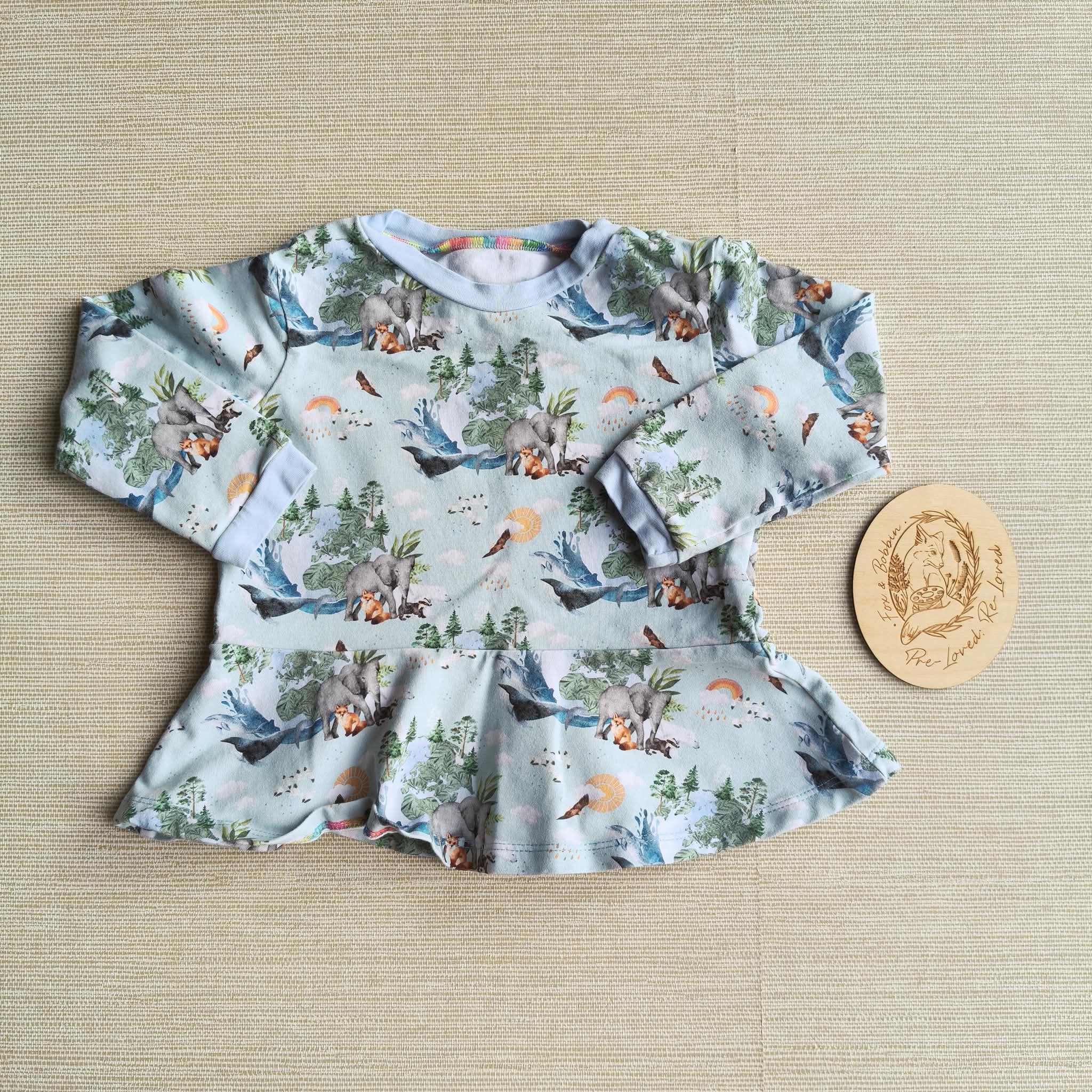 PRE-LOVED; RE-LOVED Age 2 Long Sleeve Peplum T EUC MM Animal Earth/Baby Blue with poppered neckline
