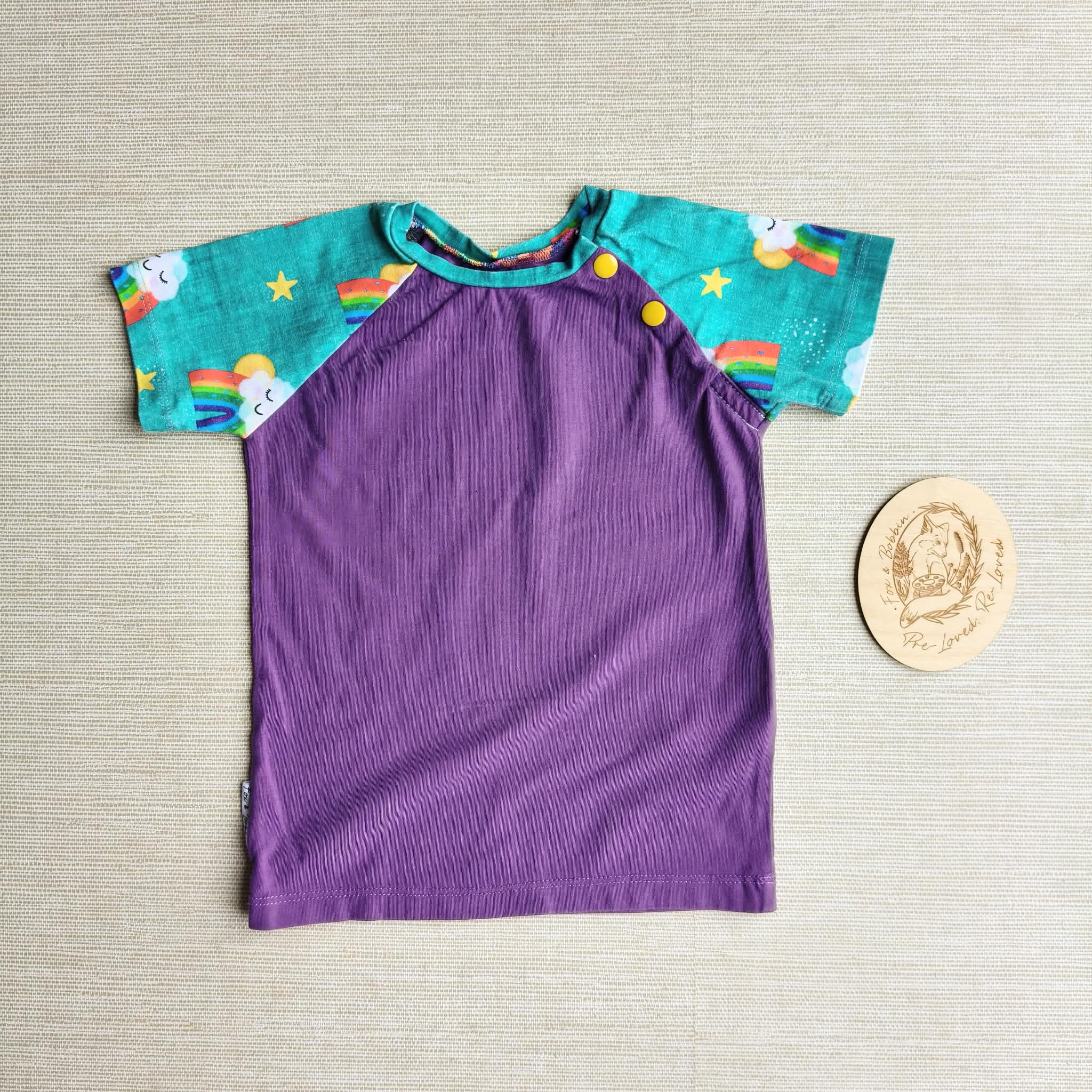 PRE-LOVED; RE-LOVED Age 2 Raglan T EUC Every Cloud/Purple with poppered neckline